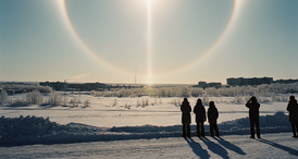 Moradores de Murmansk observam parélio, fenômeno que cria ilusão de múltiplos sóis no céu gelado