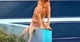 Cachorro surpreende ao observar rua sentado de forma inusitada sobre muro