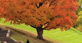 Folhas douradas cobrem o bordo, refletindo o suave calor do outono