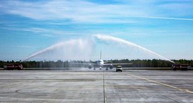 Aeronave da corporação russa Roscosmos é recebida com arcos de água no 1º voo para aeroporto do Cosmódromo de Vostochny