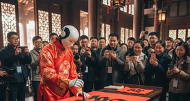 Robô com trajes típicos surpreende ao reproduzir caracteres chineses e atrai multidão em demonstração cultural.
