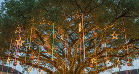 Árvore-da-chuva gigante, decorada com luzes e enfeites, chama atenção em Fort Kochi durante as festas de fim de ano.