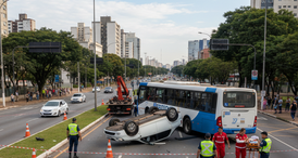 Colisão com ônibus faz carro capotar e interdita avenida em MG