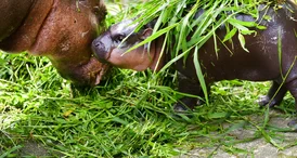 Brincadeira entre mãe e filhote de hipopótamo pigmeu encanta público