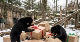 Filhotes de urso-malaio se divertem com presentes natalinos no Zoológico de Moscou