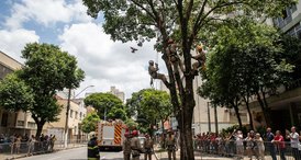 Militares do Corpo de Bombeiros utilizam técnica de ascensão para salvar ave presa no topo de árvore na capital mineira.