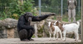 Chimpanzé defende tranquilidade diante de cabras curiosas em zoológico da China