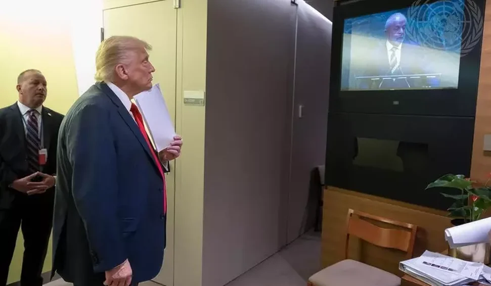 A Organização das Nações Unidas divulgou uma foto que mostra o presidente dos Estados Unidos, Donald Trump, assistindo ao discurso de seu homólogo brasileiro, Luiz Inácio Lula da Silva, na Assembleia-Geral, na última terça-feira (23).