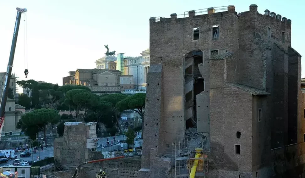 A Torre dei Conti, que domina o Largo Corrado Ricci, em Roma, e desabou parcialmente nesta segunda-feira (3), é considerada um marco da história medieval e do poder papal.