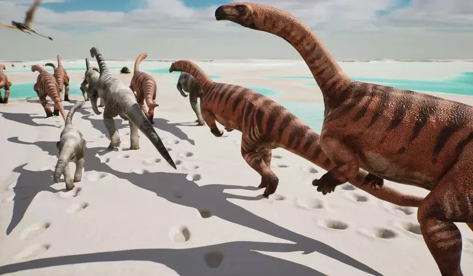 Esses espécimes se moviam ao longo das margens banhadas pelas águas quentes do Oceano Tétis (que existiu entre 250 milhões e 50 milhões de anos atrás), em um ambiente semelhante ao das áreas tropicais atuais, com planícies de maré que se estendiam por centenas de quilômetros.