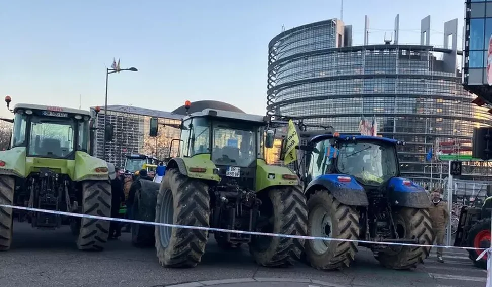 Agricultores da França utilizaram tratores para realizar um protesto em frente à sede do Parlamento Europeu, em Estrasburgo, contra o acordo entre Mercosul e União Europeia.