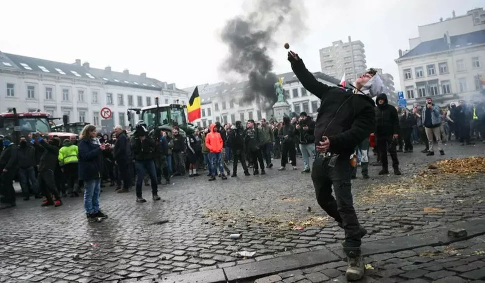 A polícia interveio inicialmente com hidrantes para dispersar os manifestantes reunidos diante do Parlamento Europeu e depois avançou usando gás lacrimogêneo. Já os agricultores lançaram batatas, beterrabas, ovos, pedras, garrafas e rojões contra as forças de segurança.