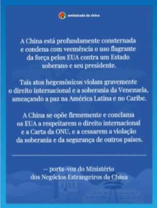A China também instou os Estados Unidos a respeitarem o direito internacional e a Carta das Nações Unidas, pedindo a cessação imediata de qualquer ação que represente violação da soberania e da segurança de outros países. O texto reforça a posição histórica de Pequim em defesa da não intervenção, do multilateralismo e da solução pacífica de controvérsias.