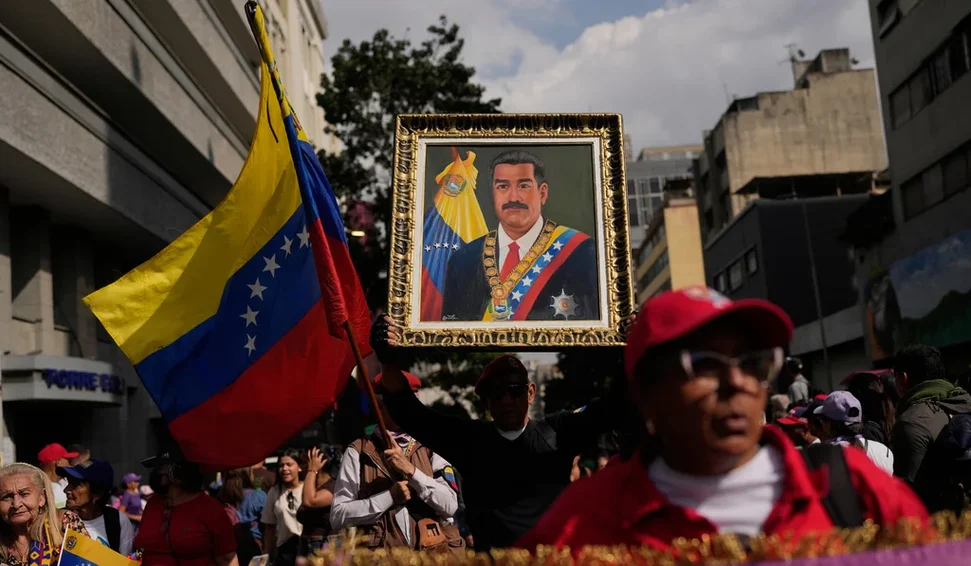 Um morador local passa por um mural que retrata bombas e poços de petróleo em Caracas, Venezuela, na terça-feira, 6 de janeiro de 2026. (Foto AP/Matias Delacroix)