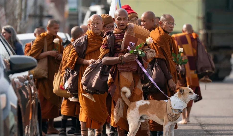 Um grupo de Monges budistas e seu cão de resgate estão andando em fila indiana por estradas rurais e rodovias do Sul, cativando os americanos em todo o país e inspirando os montes de moradores locais para cumprimentá-los ao longo de seu percurso.