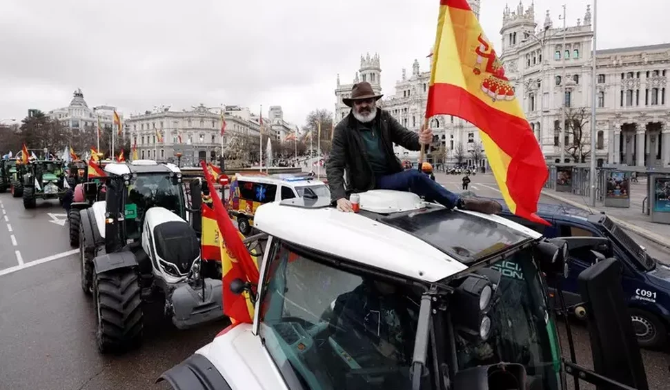 Cerca de 1,5 mil agricultores, segundo dados da Prefeitura de Madri, agitaram bandeiras da Espanha e denunciaram o impacto do acordo UE-Mercosul sobre os trabalhadores europeus.
