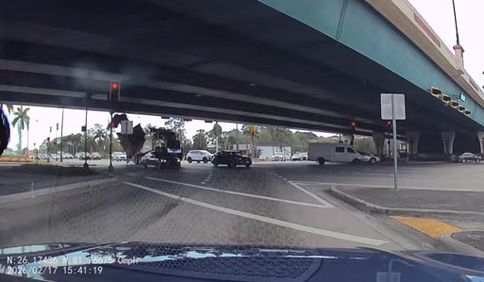 Sudeen Dasouza, cuja dashcam registrou as imagens, disse que estava no cruzamento da Golden Gate Parkway com a Airport Pulling Road em Nápoles, Flórida, quando a colisão ocorreu.