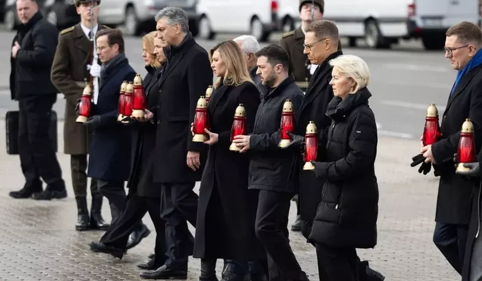Lideranças da União Europeia viajaram a Kiev nesta terça-feira (24) para prestar solidariedade à Ucrânia no dia que marca o quarto aniversário do início da invasão em larga escala promovida pela Rússia.