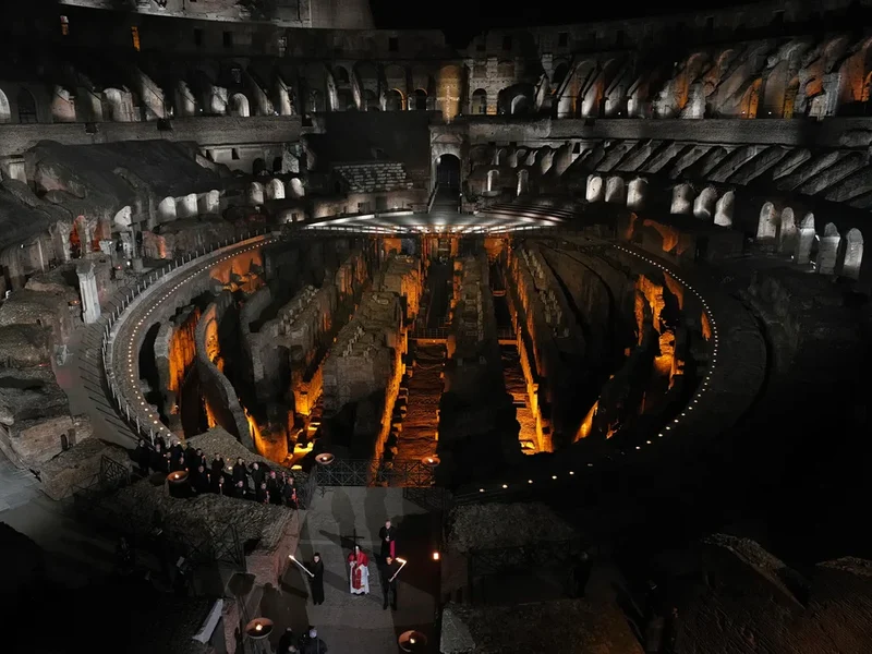 A Via Sacra comemora as horas finais da vida de Jesus’, desde sua sentença de morte até a tomada da cruz até sua crucificação, morte e sepultamento. A procissão termina fora do Coliseu, no topo do Monte Palatino.