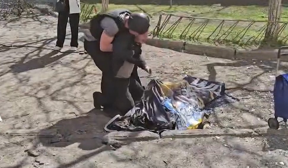 Um vídeo divulgado pelo governador da região de Kherson, Oleksandr Prokudin, mostra um homem chorando sobre um corpo e gritando "mamãe" no pátio de um prédio de apartamentos no distrito de Korabelnyi, na cidade. Prokudin afirmou que a mãe do homem foi morta no ataque e que outras três mulheres, de 44, 79 e 86 anos, ficaram feridas.