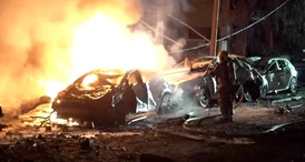 Carros em chamas enquanto serviços de emergência israelenses respondem a ataque com projétil em meio à retaliação do Irã