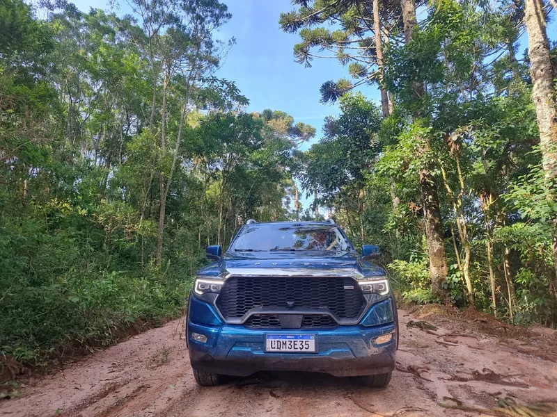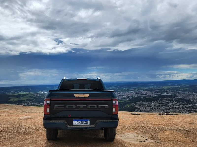 O acesso ao Pico do Lopo incluiu 24 quilômetros de asfalto e 12 quilômetros de estrada de terra, pelas estradas de Extrema e dos Expedicionários. Placas ao longo do percurso recomendam o uso de tração 4x4. Acionei o sistema eletrônico de tração integral e utilizei os modos de condução disponíveis. A Tunland V9 superou trechos de inclinação, piso irregular e pontos de baixa aderência sem interrupções no avanço.