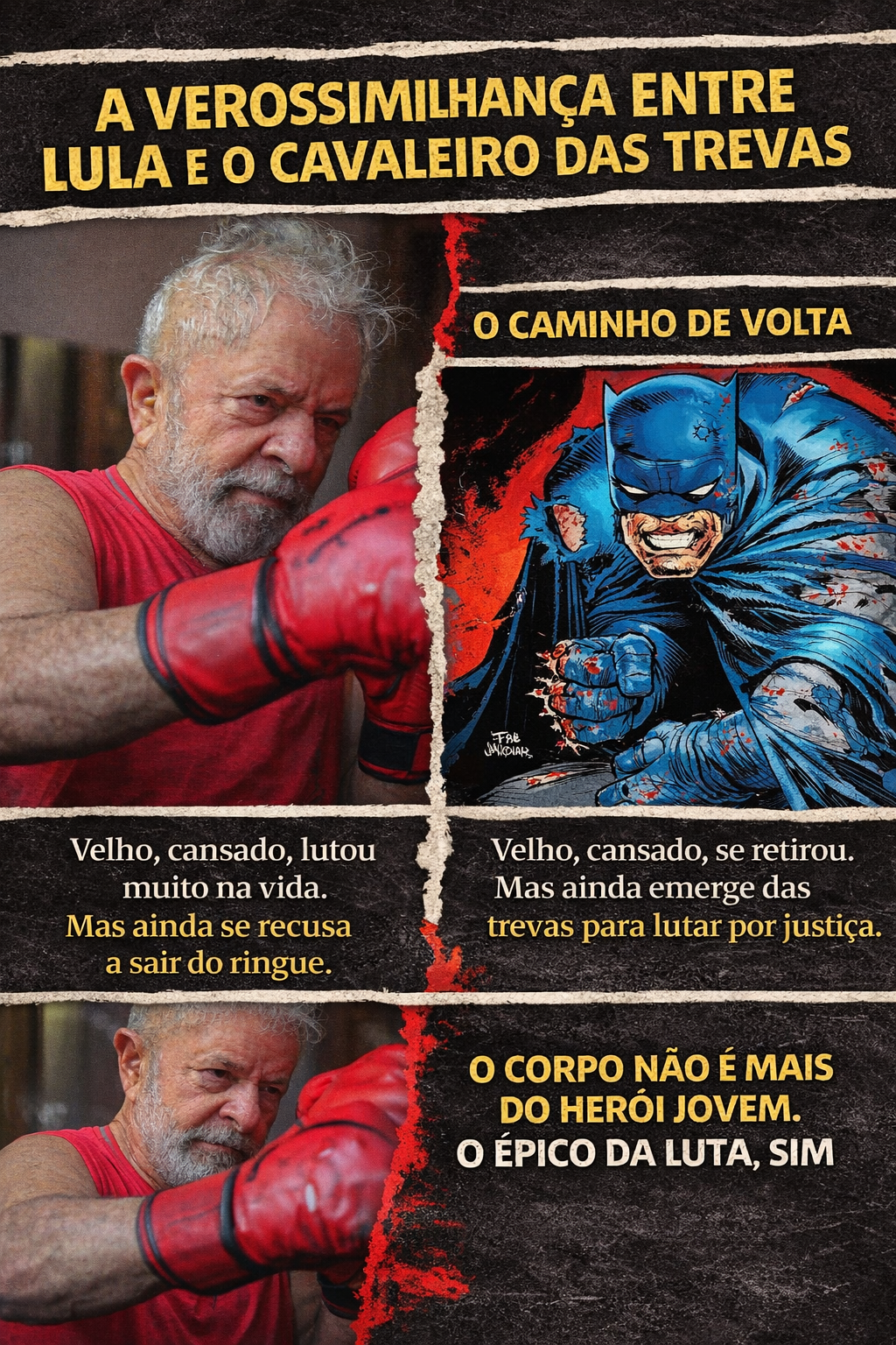 De um lado, Lula aparece emoldurado por uma cena de treino, com luvas vermelhas, semblante fechado, rugas expostas e o corpo dizendo, sem pedir licença, que o tempo passou. Do outro, a capa simbólica do velho Batman, personagem que retorna não porque esteja inteiro, mas justamente porque carrega rachaduras. Não é o herói da leveza. É o herói da resistência.