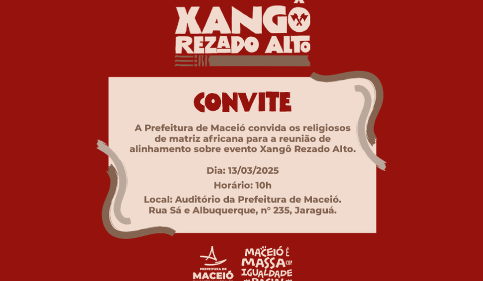 A Prefeitura de Maceió, por meio da Fundação Municipal de Ação Cultural (FMAC), realiza nesta quinta-feira, dia 13 de março, às 10h, no auditório da Prefeitura, uma reunião com religiosos de matriz africana para alinhar a organização do Xangô Rezado Alto. O evento, que já se consolidou como um dos principais atos de valorização das tradições afro-brasileiras em Maceió, será realizado no dia 21 de março, data escolhida pelas lideranças religiosas em encontros anteriores.