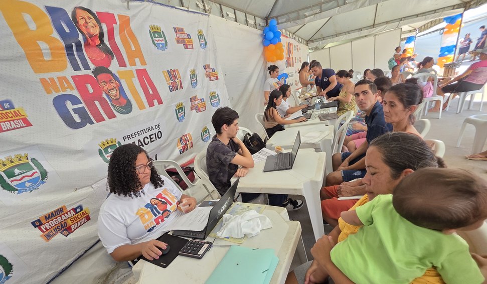 A Prefeitura de Maceió promove, nesta quarta-feira (30), mais uma edição do programa itinerante Brota na Grota, no Loteamento Palmar, bairro Rio Novo. A ação iniciou às 9h com previsão de encerramento às 15h e oferece diversos serviços públicos gratuitos à comunidade, com foco na promoção da cidadania e inclusão social.