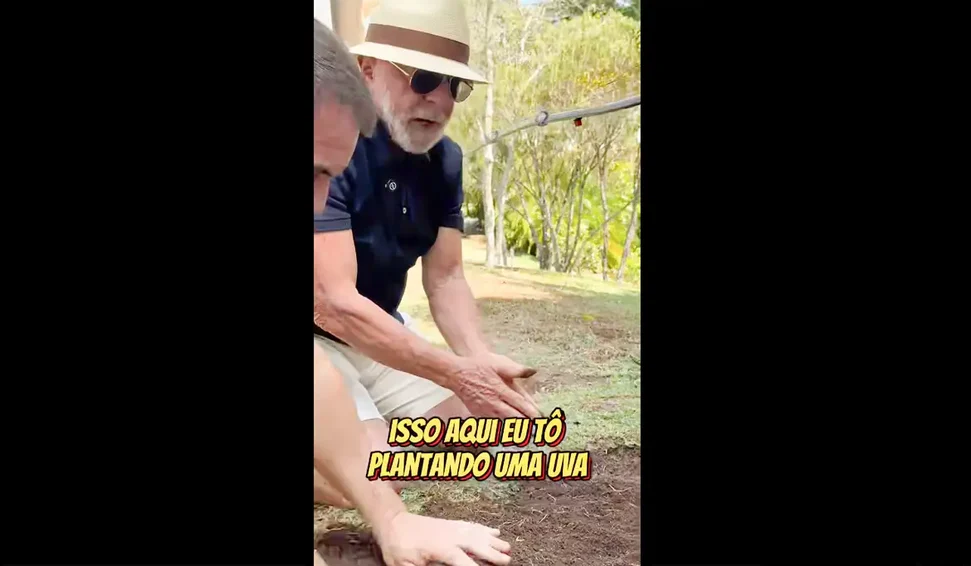 O presidente Luiz Inácio Lula da Silva publicou um vídeo em uma rede social, em que aparece plantando sementes de uva em um terreno do Palácio do Alvorada. Filmado pela primeira dama Janja da Silva, enquanto mexe na terra, Lula ressalta que está plantando comida e não violência e ódio.