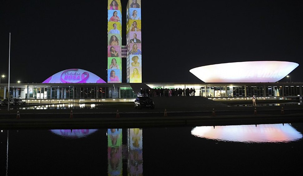 Na noite de quarta-feira (1º), o Congresso Nacional recebeu projeções em apoio à campanha Outubro Rosa. Durante algumas horas, as torres e cúpulas do Senado e da Câmara foram iluminadas com frases e imagens ressaltando a importância do diagnóstico precoce do câncer de mama.