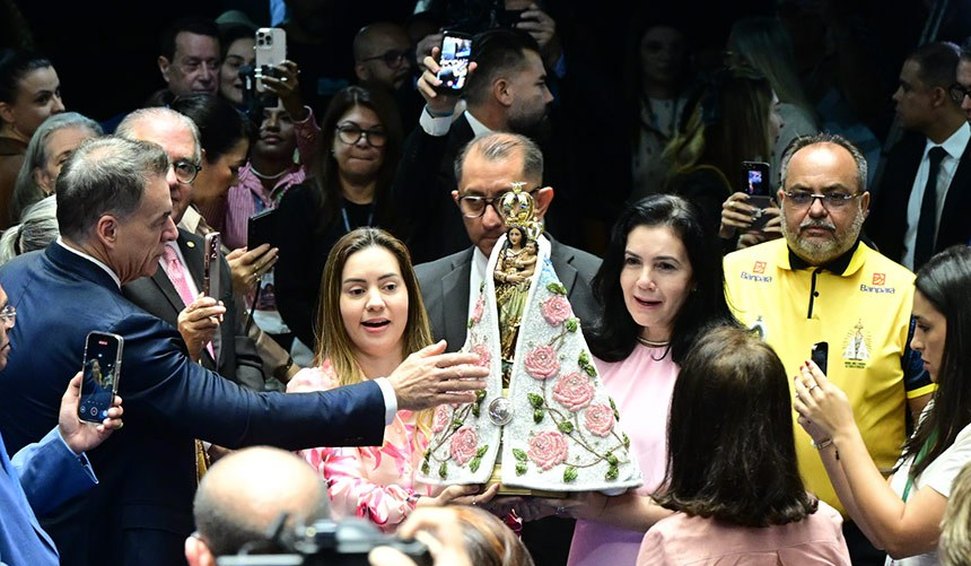 A sessão solene desta quarta, no Plenário do Senado, teve como um dos destaques a imagem peregrina de Nossa Senhora de Nazaré, que chegou ao local levada por Liana Andrade, esposa do presidente do Senado, Davi Alcolumbre, e por Geise Honaiser, esposa do deputado federal Marcio Honaiser (PDT-MA). A imagem foi trazida a Brasília na terça-feira (4) para uma programação que inclui procissões e missas na Catedral e em outras paróquias da capital.