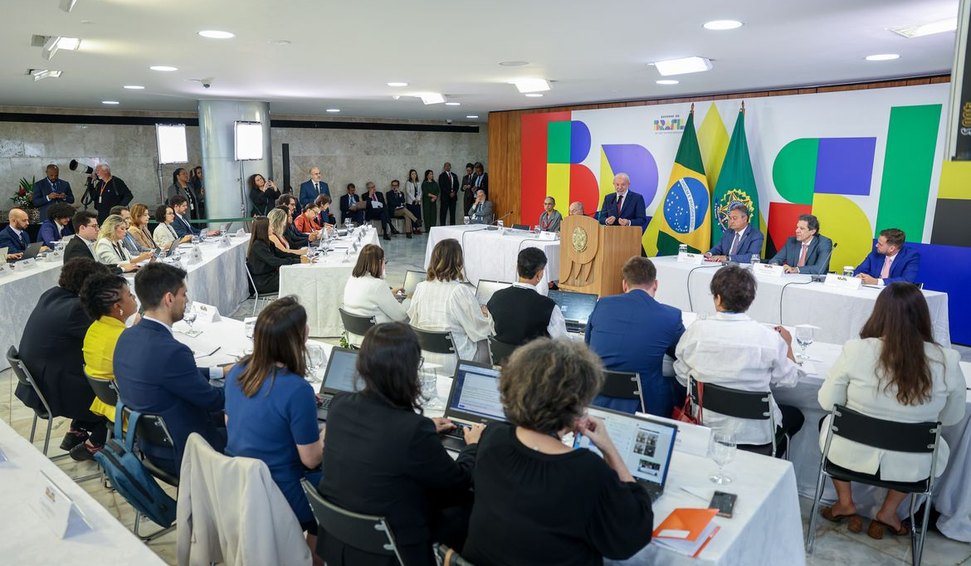 Na manhã desta quinta-feira, Lula recebeu jornalistas para um café da manhã, no Palácio do Planalto, seguido de coletiva de imprensa. Ele está acompanhado dos ministros da Fazenda, Fernando Haddad; da Casa Civil, Rui Costa; das Relações Exteriores, Mauro Vieira; e do Meio Ambiente e Mudança do Clima, Marina Silva.