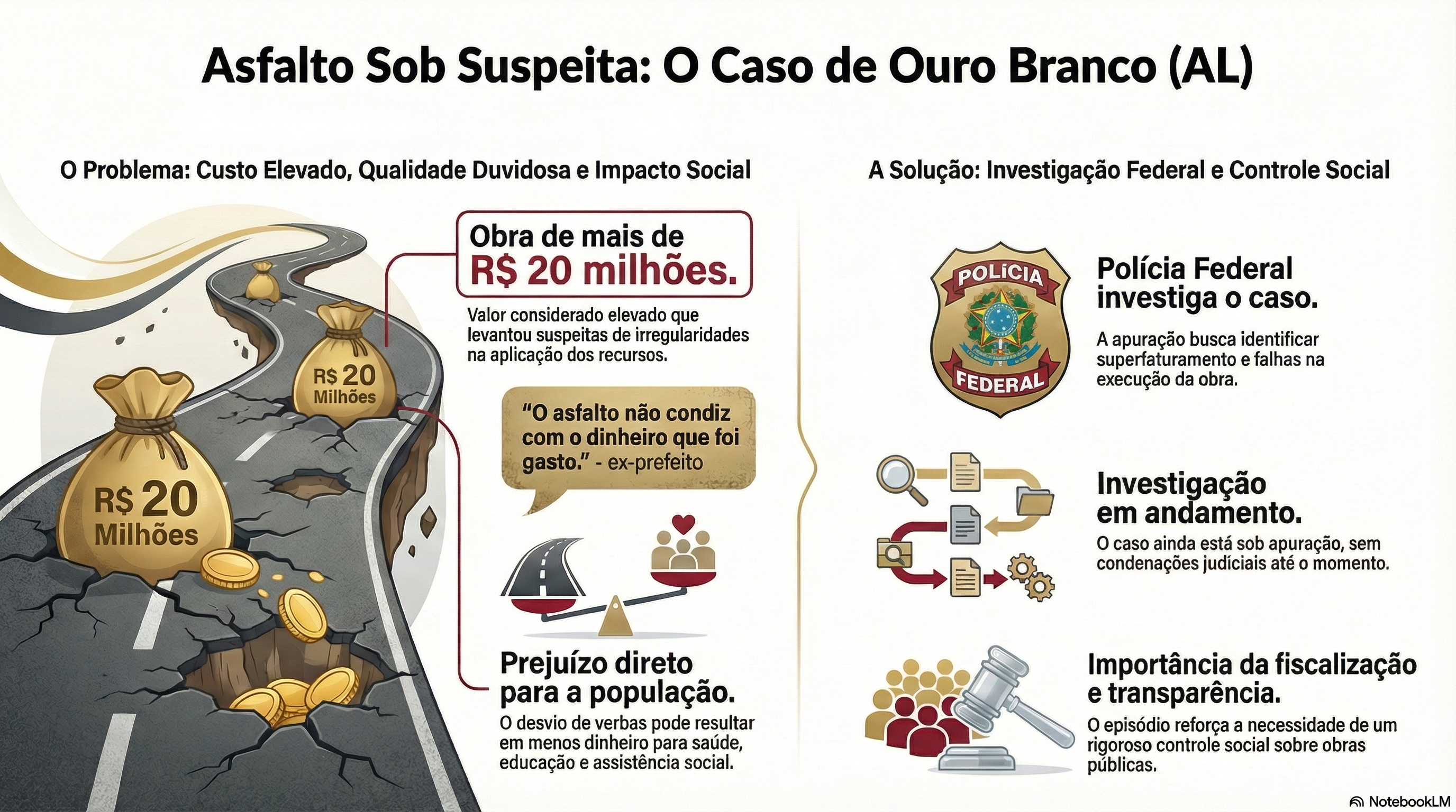 No vídeo, Atevaldo Cabral afirma que o asfalto executado apresenta qualidade duvidosa, incompatível com o volume de recursos investidos. Segundo ele, foi justamente essa discrepância entre custo e execução que acabou colocando Ouro Branco no radar dos órgãos de controle e fiscalização federais.