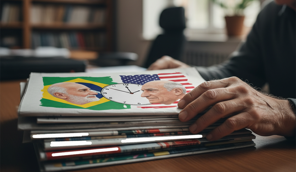 O texto, ilustrado com Lula grisalho diante de uma bandeira do Brasil e uma cabine de votação, também menciona a prisão do ex-presidente Jair Bolsonaro por conspiração para um golpe de Estado. Recorda que o então presidente dos EUA, Donald Trump, alegou falsamente tratar-se de armação e impôs tarifas punitivas a produtos brasileiros, mas depois recuou.