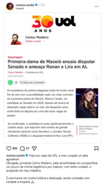 A primeira-dama de Maceió, Marina Candia, repercutiu em suas redes sociais uma reportagem publicada pelo portal UOL que aponta seu nome como um dos cotados para disputar uma vaga no Senado Federal nas eleições de 2026, em Alagoas.