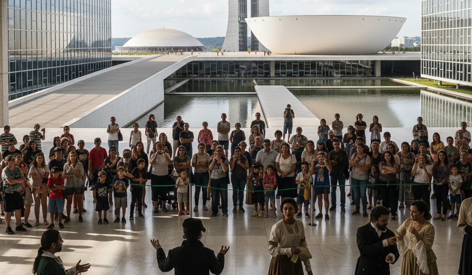 Em sua terceira edição, o Visite EnCena traz o tema “Vozes que Constroem o Brasil” e oferece uma experiência educativa e divertida, ideal para famílias e turistas. Ao longo do percurso pelas duas Casas Legislativas, esquetes teatrais quebram a formalidade do ambiente político e convidam o público a mergulhar na história do país.