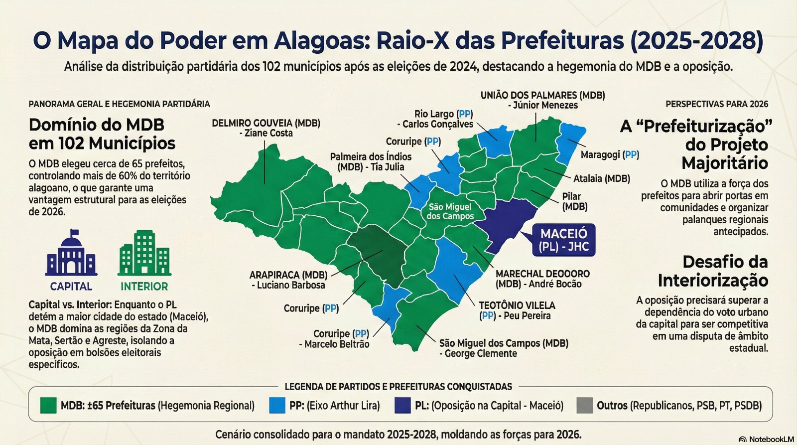 A fotografia do poder municipal em Alagoas segue apontando para um cenário de vantagem estrutural do MDB na corrida de 2026. Com aproximadamente 70 prefeituras, segundo números divulgados em matérias sobre a contabilidade partidária e o movimento de filiações no pós-eleição municipal, a legenda do senador Renan Filho mantém a maior capilaridade no estado - uma rede de prefeitos que pesa especialmente em eleições majoritárias, quando a engrenagem do “municipalismo” costuma funcionar como cabo eleitoral, palanque e logística de campanha.