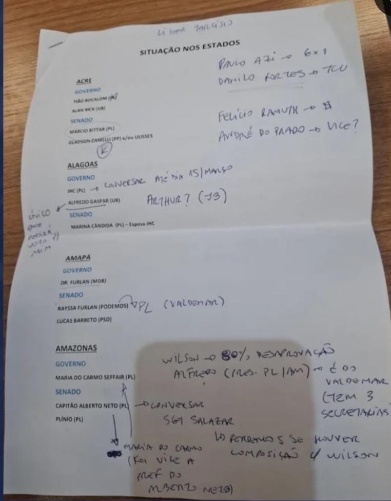 As anotações não representam anúncio oficial de candidaturas, mas revelam, ao menos no plano estratégico, que o grupo político ligado ao senador estaria mapeando cenários competitivos nos estados.