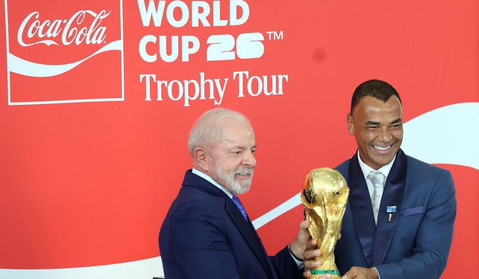 O presidente Luiz Inácio Lula participou, nesta quinta-feira (26), da cerimônia oficial Tour da Taça da Copa do Mundo da Fifa 2026, no Palácio do Planalto. Ex-jogadores de futebol, como Cafu, Jairzinho, Branco, Edmílson, Pepe e a ex-atleta Formiga, da Seleção Feminina, também estiveram presentes no evento, além de ministros e outras autoridades.