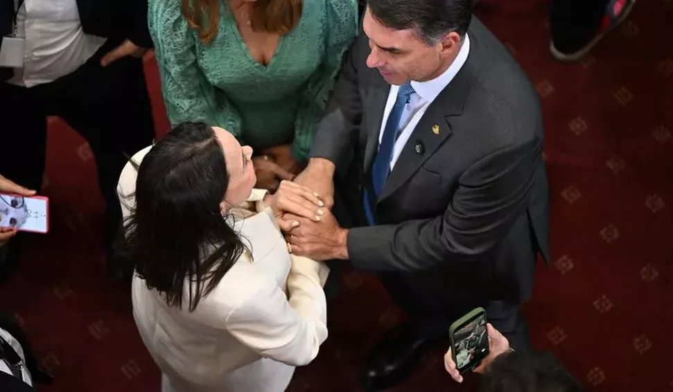 O senador Flávio Bolsonaro, filho do ex-presidente Jair Bolsonaro, se encontrou nesta quarta-feira (11) com María Corina Machado, líder da oposição na Venezuela e Prêmio Nobel da Paz em 2025.