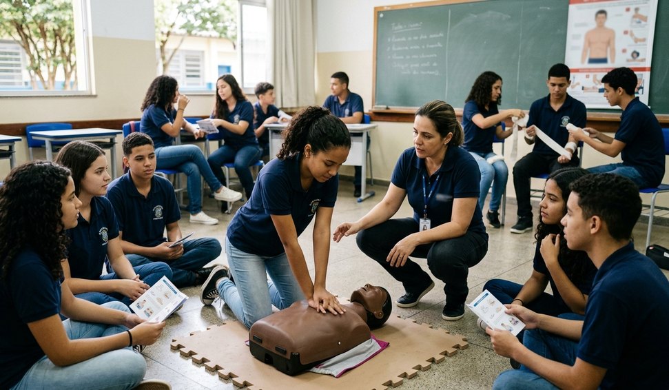 Segundo o autor, o objetivo é preparar os alunos para agir em emergências, como engasgos e desmaios, aumentando as chances de atendimento adequado antes da chegada de socorro especializado. O texto alternativo especifica que a capacitação não exigirá mudanças no currículo escolar e poderá ser integrada a atividades já existentes.