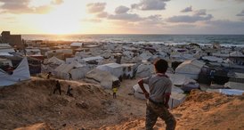 Palestinos deslocados caminham por um acampamento de tendas em Muwasi, uma área que Israel designou como zona segura