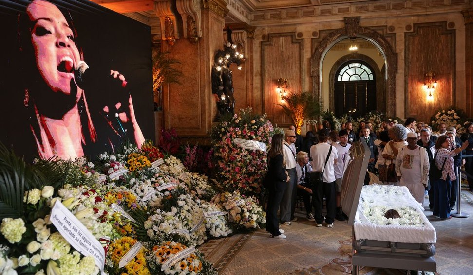 Abaixo do telão, dezenas de coroas de flores. Uma delas era do presidente Lula e da esposa, Janja da Silva, com a menção a música “Só o amor” de autoria da Preta. Na faixa, os dizeres: “Nasceu para voar, fez seu destino, tocou o céu e espalhou só o amor. O Brasil agradece sua luz”. Janja esteve no velório, acompanhada da ministra da Cultura, Margareth Menezes.