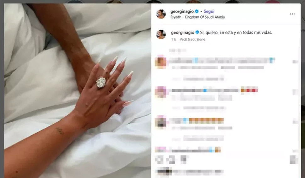 Em seu perfil no Instagram, Georgina compartilhou uma foto mostrando as mãos unidas e o anel de diamante que o jogador de futebol lhe deu. "Sim, eu quero. Nesta e em todas as minhas vidas", escreveu ela.