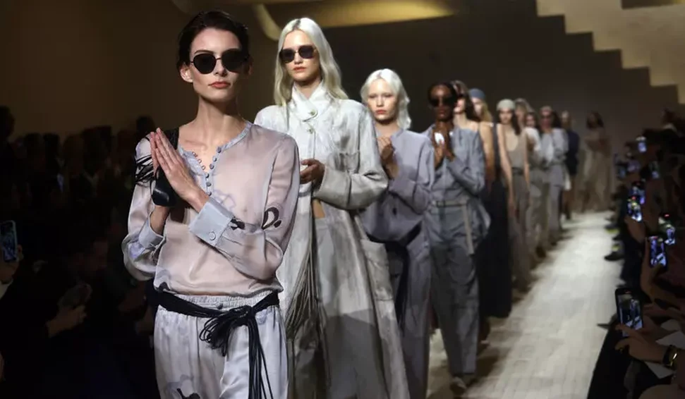 Um look especial para o dia a dia que, para a noite, dá lugar a vestidos em nylon leve usados com tops pequenos cravejados de cristais e túnicas curtas com bordados brilhantes. Uma coleção digna de aplausos, porque para Giorgio Armani, sempre comprometido com a criação até o fim, a nova coleção era sempre a mais importante, segundo aqueles que trabalharam ao seu lado.