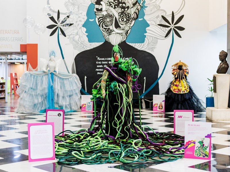 Ao todo, a exposição na Biblioteca Pública do Paraná conta com 10 figurinos expostos: Bruxa (João e Maria), Pé de Feijão, Fada Madrinha (Cinderela), Madrasta (Cinderela), Cinderela, Chapeuzinho Vermelho, Pequena Sereia, Príncipe Encantado, Espantalho (O Mágico de Oz), e Fada Primavera (A Bela Adormecida). Entre os destaques da mostra está o figurino da Pequena Sereia, confeccionado especialmente para a temporada portuguesa, que leva colheres de plástico e garrafas pet; e o Pé de Feijão, feito com mangueiras de jardim, espumas e tubos corrugados pintados, e peneiras de cozinha.