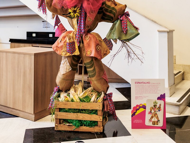 A proposta da exposição “Caminhos do Encantamento”, que faz parte da programação oficial do festival de teatro infantil “Era uma vez, eram duas… Eram três”, é proporcionar uma imersão no universo mágico dos contos de fadas a partir da recriação de figurinos de personagens clássicos da literatura infantil. “As peças dessa exposição são uma grande brincadeira de ressignificação de materiais e uma permissão para invenção de infinitas possibilidades. A Chapeuzinho Vermelho, que vai levar doces na vovozinha – como na canção de Braguinha – aparece com um traje todo feito de embalagens de doces na cor vermelha. A Bruxa, de João e Maria, que atraia as crianças para dentro de sua casa de doces, aparece com um colar feito de colheres de pau, mangas e avental feitos com papel de bala e cabelo de palha de vassoura”, destaca Gustavo Krelling, que desenvolveu as peças em parceria com sua fiel costureira Glaci de Jesus.