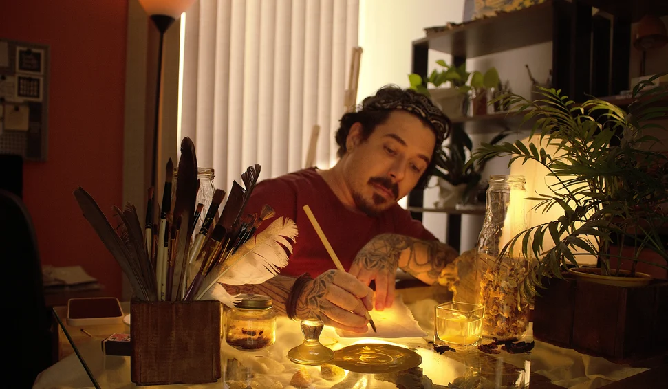 Marcos Goes é formado em Publicidade e Propaganda, empreendedor autônomo e artista natural. Trabalha com direção de criação, desenvolvimento de marcas, design e fotografia. Atuou junto ao Instituto Chico Mendes de Biologia (ICMBio) e em projetos de ativismo artístico, como o Cinzas da Floresta, em denúncia às queimadas. Nessa imersão no universo das tintas e tingimentos naturais, conseguiu reunir vasta gama de estudos e materiais, ressignificando sua forma de estar, olhar e fazer arte com soluções sustentáveis. Hoje, utiliza pigmentos naturais, produzindo as próprias tintas com baixíssimo impacto ambiental.