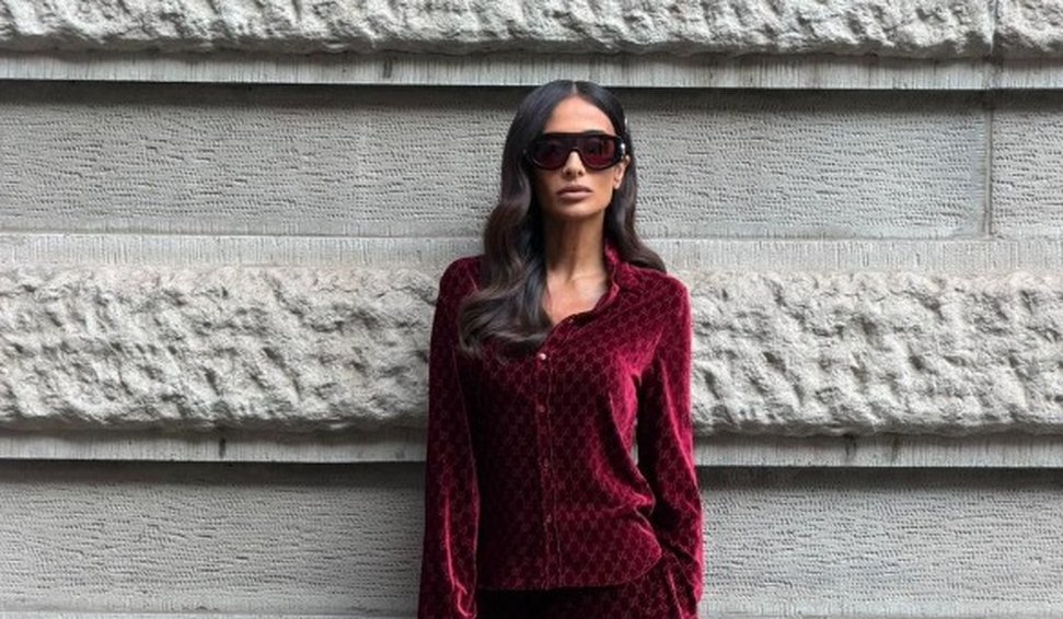 Para acompanhar a apresentação, Silvia escolheu um conjunto em veludo vinho, com camisa de botões e calça de modelagem ampla, ambas com padronagem monogramada, reforçando a identidade clássica da marca sob uma leitura contemporânea. A produção foi finalizada com bolsa estruturada preta de alça curta em bambu, sapatos de acabamento polido e óculos de sol oversized, criando um visual sofisticado e marcante.